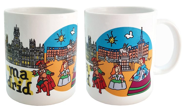 Disfruta de tu bebida favorita en la taza souvenir de la capital de España. En la taza podemos ver iconos y lugares tan representativos como las MENINAS, PLAZA MAYOR, el nuevo Ayuntamiento situado en el Palacio de Telecomunicaciones... En la sección de tazas podrás ver la TAZA MADRID MONUMENTOS.